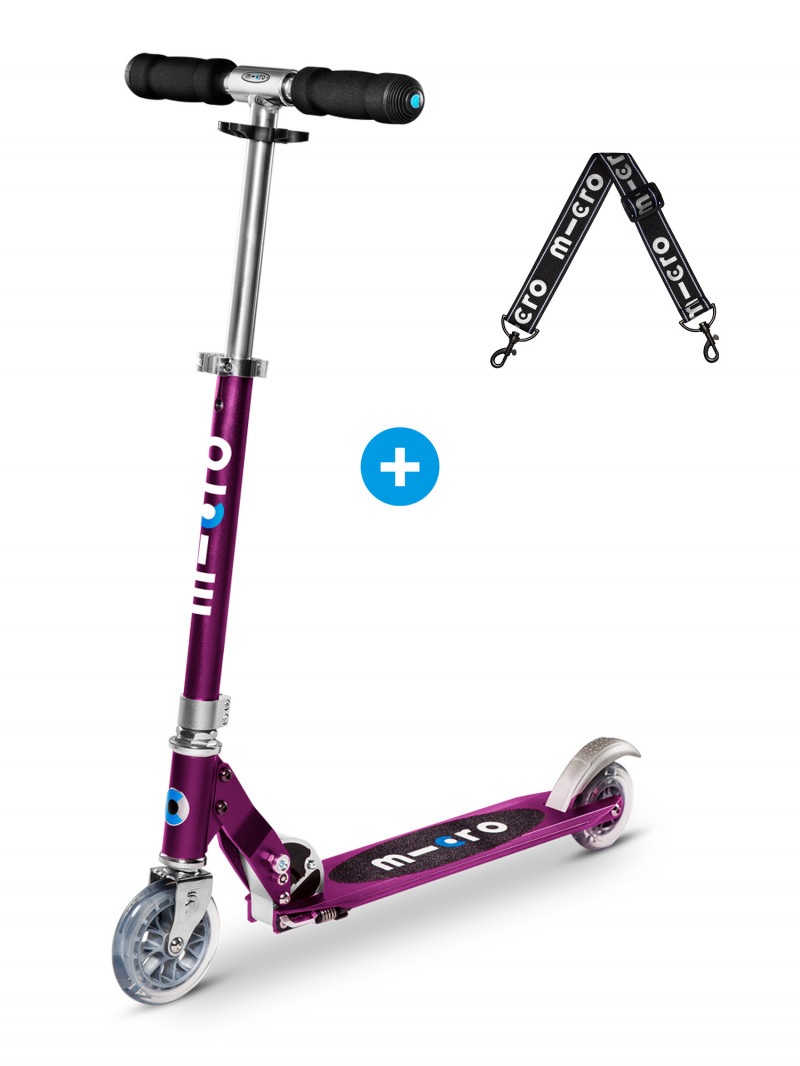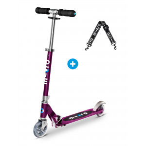La trottinette classique Micro pliable, légère et lookée aux couleurs des juniors et les ados accros aux 2 roues. Profitez de ce pack pour Micro Sprite, composé d'une Micro Sprite Violet ainsi que d'une lanière noir qui vous permet de porter votre trottinette pliée sur l’épaule !