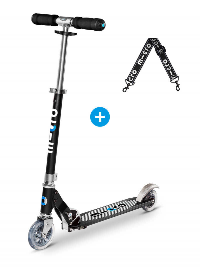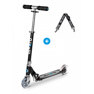 La meilleure trottinette pour les enfants dès 6 ans. Profitez de ce pack pour Micro Sprite, composé d'une Micro Sprite Noir avec son grip rayé, ainsi que d'une lanière noir qui vous permet de porter votre trottinette pliée sur l’épaule !
