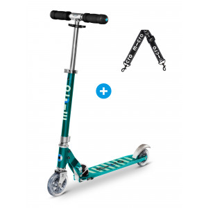 L’indispensable trottinette 2 roues pour les enfants et les ados. Profitez de ce pack pour Micro Sprite, composé d'une Micro Sprite Bleu Pétrole ainsi que d'une lanière noir qui vous permet de porter votre trottinette pliée sur l’épaule !