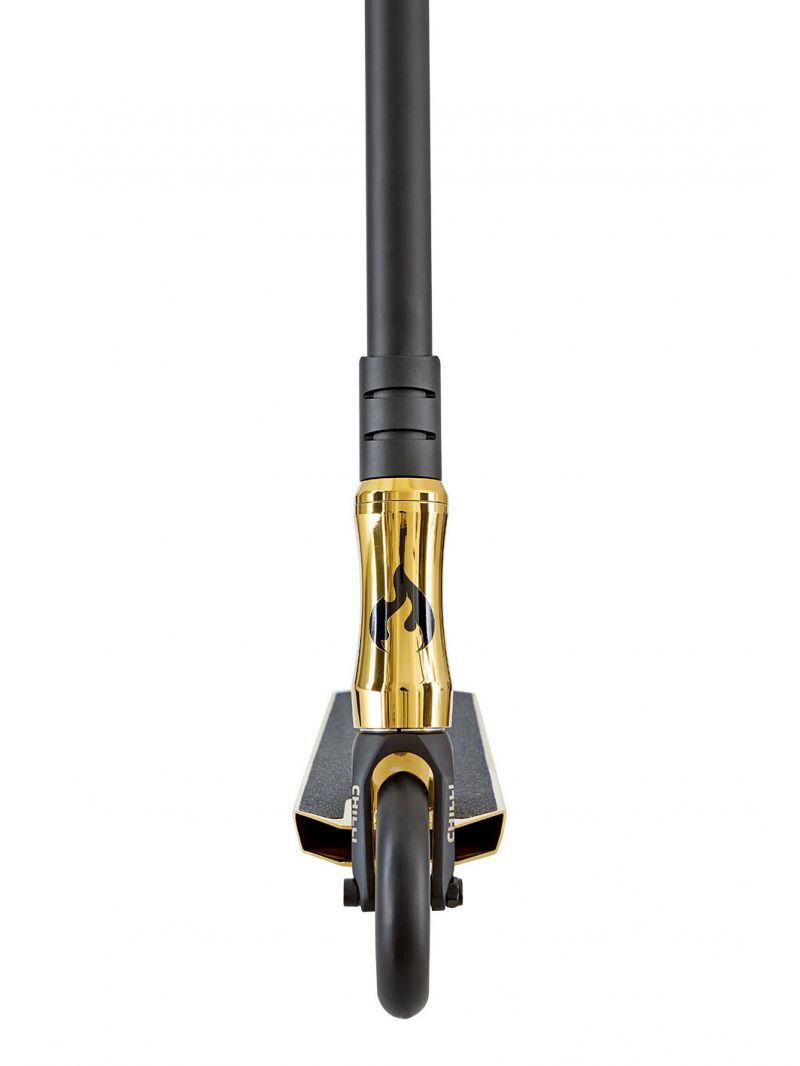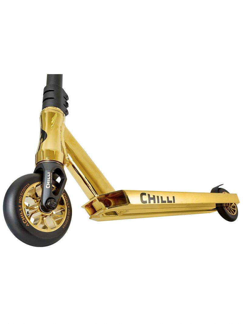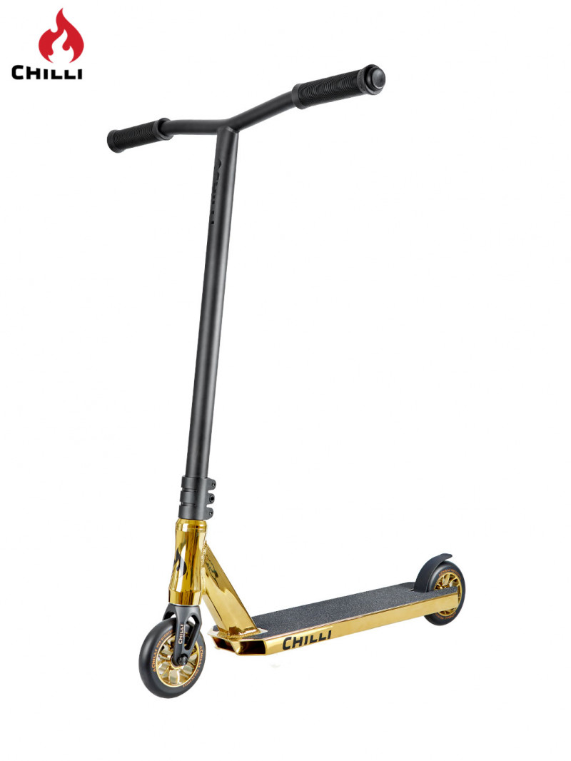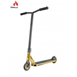Avec une finition et un équipement ultra complet, la Chilli Reaper est la trottinette au rapport prix/performance imbattable. Elle est très robuste tout en restant légère pour réaliser des figures dans les skate-parks. Elle est très populaire auprès des riders de la Team Chilli ! La trottinette Freestyle Chilli Reaper est livrée de série avec des roues en 110 mm, mais peut également accueillir des roues en 120 mm en changeant juste le frein.