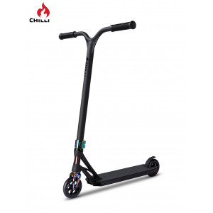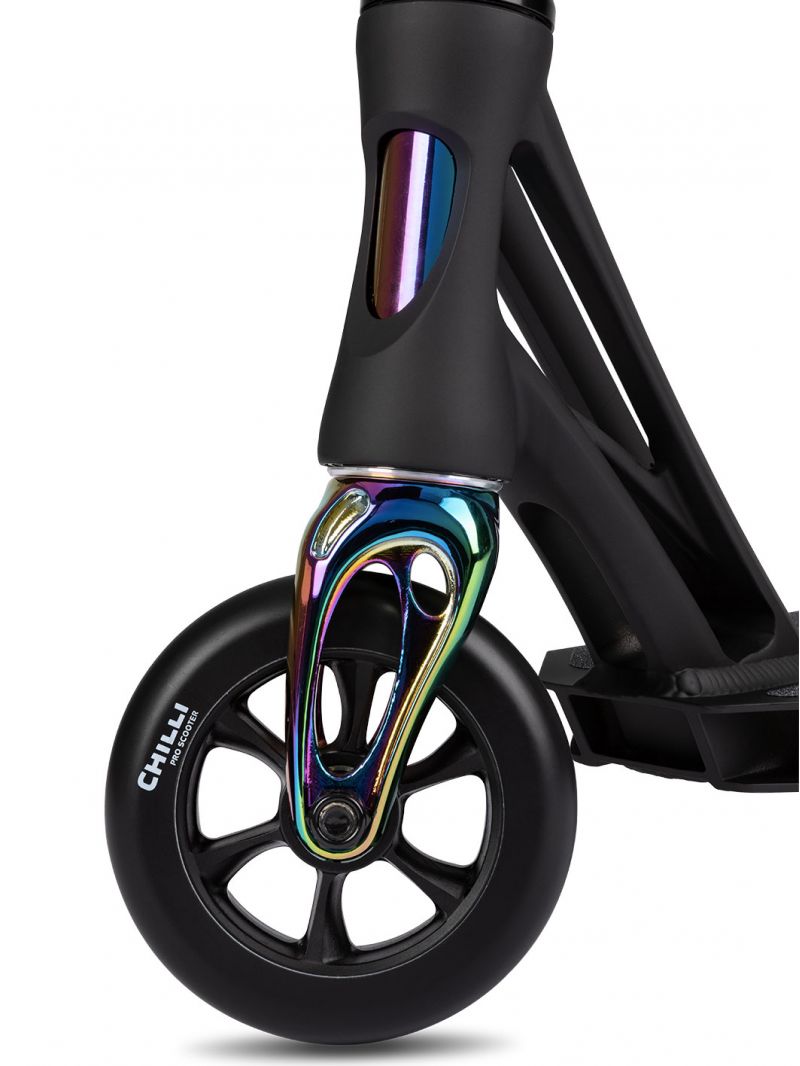 La trottinette Freestyle Chilli Beast V2 est une trottinette d'exception de part son design et sa finition. Sa tête de direction unique forgée en une pièce positionnée entre une fourche en aluminium épurée et un collier de serrage à 2 vis M8 fin et élégant, font de la Chilli Beast V2 une trottinette freestyle haut de gamme et unique. La combinaison d'une peinture néochrome et d'un noir mat apporte un look élégant et puissant. La trottinette Chilli Beast V2 comprend un T-bar en aluminium ultra légère, un deck unique design et équilibré et des roues turbo de 110 mm. Des roues de 120 mm peuvent être installées facilement en adaptant simplement un nouveau frein.