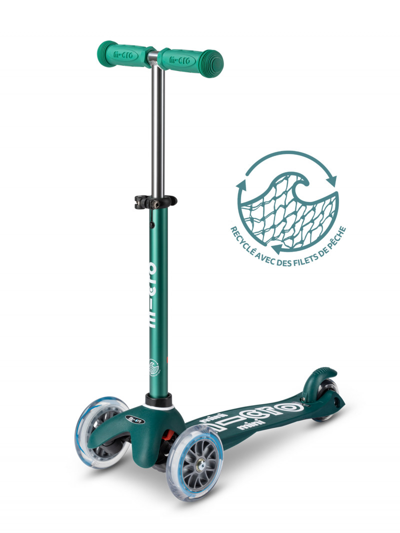 Sur la trottinette Mini Micro Deluxe Éco, la planche et le frein sont fabriqués à partir de filets de pêche usagés, puis recyclés.