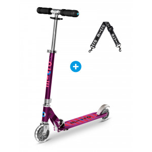 La Micro Sprite est LA trottinette idéale pour les juniors et ados adeptes des trottinettes 2 roues ! Le gros plus de la trottinette : ses roues lumineuses ! Profitez de ce pack pour Micro Sprite, composé d'une Micro Sprite Violet LED ainsi que d'une lanière noir qui vous permet de porter votre trottinette pliée sur l’épaule !