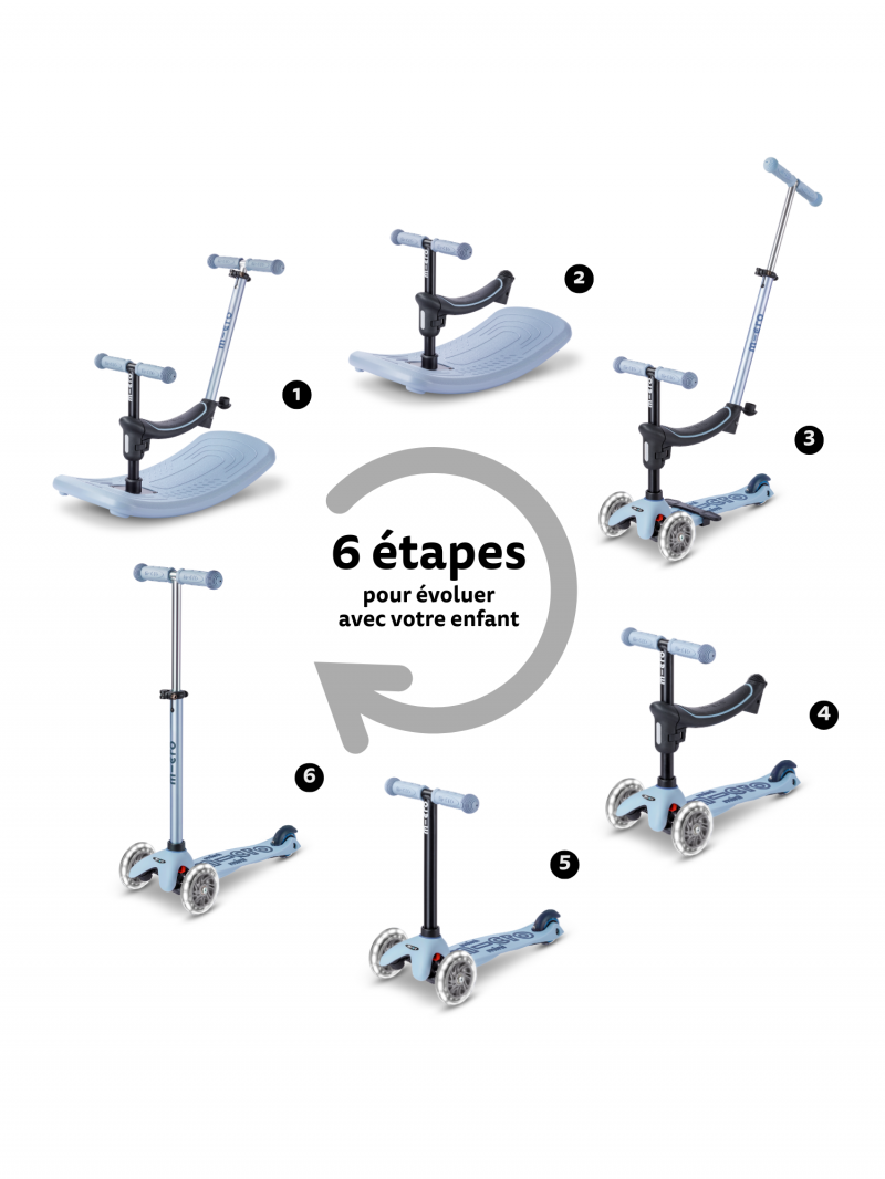 Les trottinettes Mini Micro 3-en-1 grandissent avec votre enfant. Utilisée dans un premier temps comme un porteur (le siège se règle en hauteur), vouspourrez pousser votre enfant avec la barre de poussée télescopique et amovible. En grandissant vous pourrez retirer le siège et votre enfant commencera à appréhender l’utilisation de sa trottinette. Pour finir vous pourrez installer la barre en T.