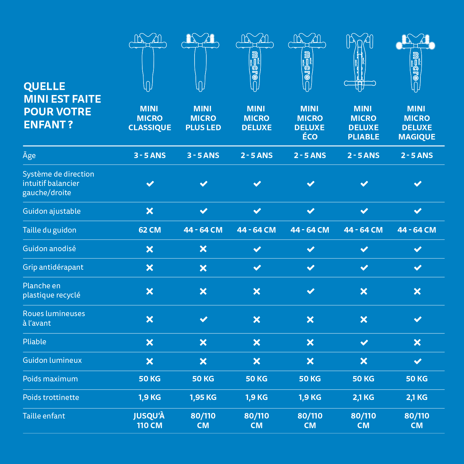 Il existe plusieurs modèles de Mini Micro. Découvrez leurs caractéristiques et choisissez celle qui correspond à votre enfant :